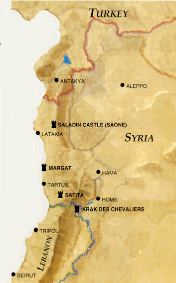 Durant les croisades, le Krak et le Marqab étaient tenus par les Hospitaliers et la Tour de Safita par les Templiers.