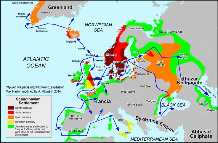 Après les Iles Britanniques, des Vikings norvégiens, cherchant l'aventure et la gloire, continuèrent de progresser vers l'Ouest. Ils colonisèrent ainsi l'Islande à partir de 860 et Erik le Rouge, banni d'Islande à cause d'un meurtre, s'installa au Groenland en 982 avec sa famille (le Groenland avait été découvert par hasard quelques années plus tôt par un marin égaré).