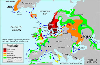 Les Vikings étaient alors installés dans le nord de l'Allemagne actuelle (Saxe) et commerçaient normalement, par terre et par mer, avec tous les pays limitrophes et même au-delà, jusqu'en Méditerranée. Ils vendaient à cette époque des fourrures, des objets forgés, de l'ambre, de l'ivoire, des faucons, du miel, de la cire... et achetaient des armes, du sel, des épices, du vin, de la soie... Vers la fin du VIIIème siècle, la domination arabe en Méditerranée entrava fortement les relations commerciales pratiquées par les Scandinaves avec les pays du Sud. Il leur fallut alors développer d'autres filières, éventuellement par la force... !